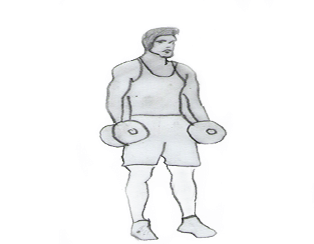 Stand up straight with your torso erect and hold dumbbells on your sides with arms straight. For comfort, you can slightly bend your knees.