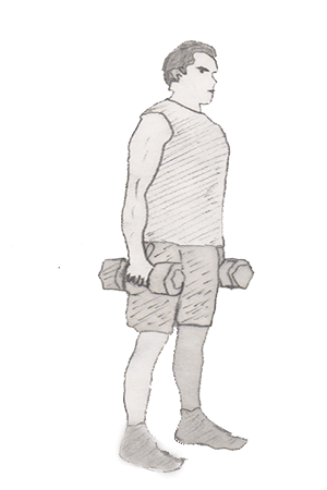 - Hold the dumbbell according to your experience level. Ladies probably carry between 10-15 pounds and gentlemen 25-50 pounds.