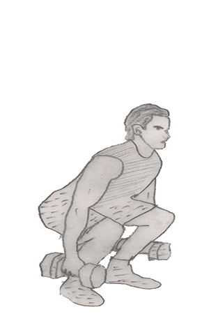 To squat up, keep your dumbbells in line with your feet, knees should be parallel to ninety degrees as much as possible. And drop your lower torso to the ground by keeping your arm loose.